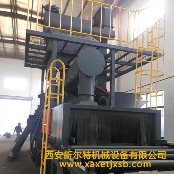 内蒙通过式抛丸清理机,清理过程中由电气控制的可调速输送辊道将钢结构件或钢材送进清理机室体内抛射区,其周身各面受到来自不同坐标方位的强力密集弹丸打击与磨擦,使之其上的氧化皮、锈层及其污物迅速脱落,钢材表面就获得一定粗糙度的光洁表面,在清理室外两边进出口辊道装卸工件。落入钢材上面的弹丸与锈尘经吹扫装置吹扫,撒落下来的丸尘混合物由回收螺旋输送到室体漏斗、纵横向螺旋输送机汇集于提升机下部,再提升到机器上部的分离器里,分离后的纯净弹丸落入分离器料斗中内,供抛丸循环使用。抛丸清理中产生尘埃,由抽风管送向除尘系统,净化处理后的净气排放到大气中,颗粒状尘埃被捕捉收集。