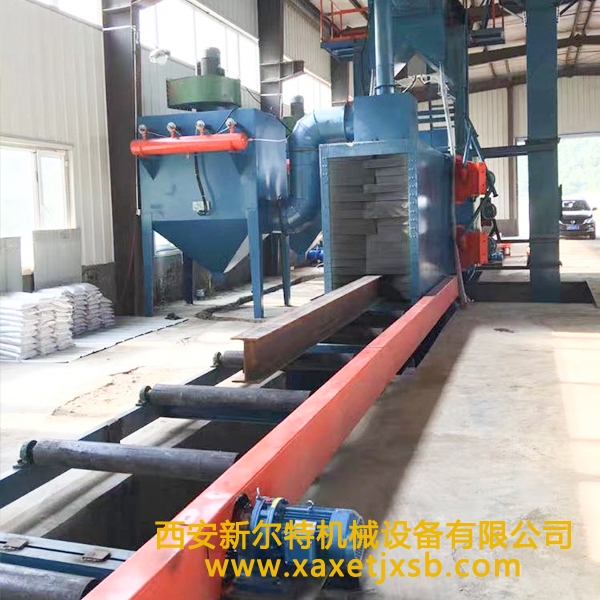 通过式抛丸清理机OD(中国),清理过程中由电气控制的可调速输送辊道将钢结构件或钢材送进清理机室体内抛射区,其周身各面受到来自不同坐标方位的强力密集弹丸打击与磨擦,使之其上的氧化皮、锈层及其污物迅速脱落,钢材表面就获得一定粗糙度的光洁表面,在清理室外两边进出口辊道装卸工件。落入钢材上面的弹丸与锈尘经吹扫装置吹扫,撒落下来的丸尘混合物由回收螺旋输送到室体漏斗、纵横向螺旋输送机汇集于提升机下部,再提升到机器上部的分离器里,分离后的纯净弹丸落入分离器料斗中内,供抛丸循环使用。抛丸清理中产生尘埃,由抽风管送向除尘系统,净化处理后的净气排放到大气中,颗粒状尘埃被捕捉收集。
