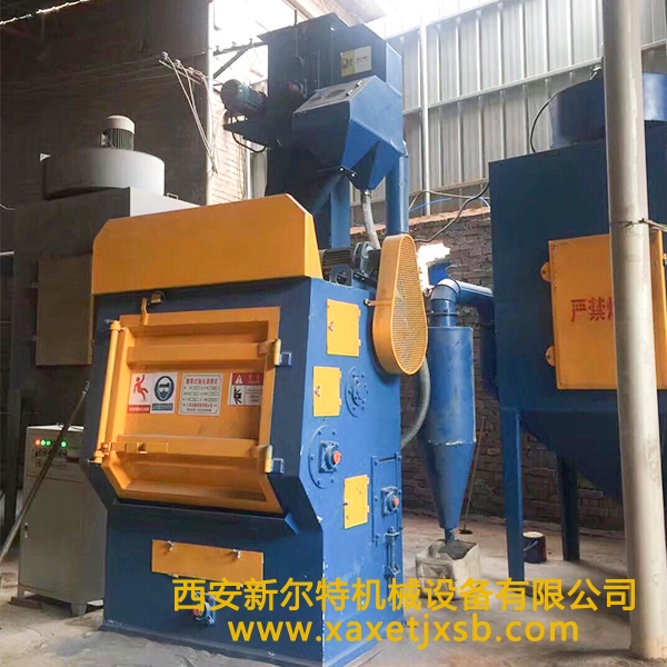 在清理仓内加入规定数量的工件后,大门关闭,机器启动,工件被滚筒带动,开始翻转,同时抛丸器高速抛出的弹丸形成扇形束,均匀地打击在工件表面上,从而达到清理的目的。